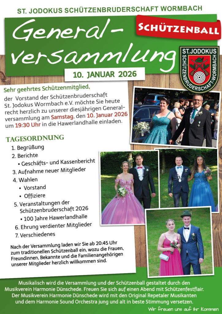 der Vorstand der Schützenbruderschaft St. Jodokus Wormbach e.V. möchte Sie heute recht herzlich zu unserer diesjährigen Generalversammlung am Samstag, den 10. Januar 2026 um 19:30 Uhr in die Hawerlandhalle einladen.