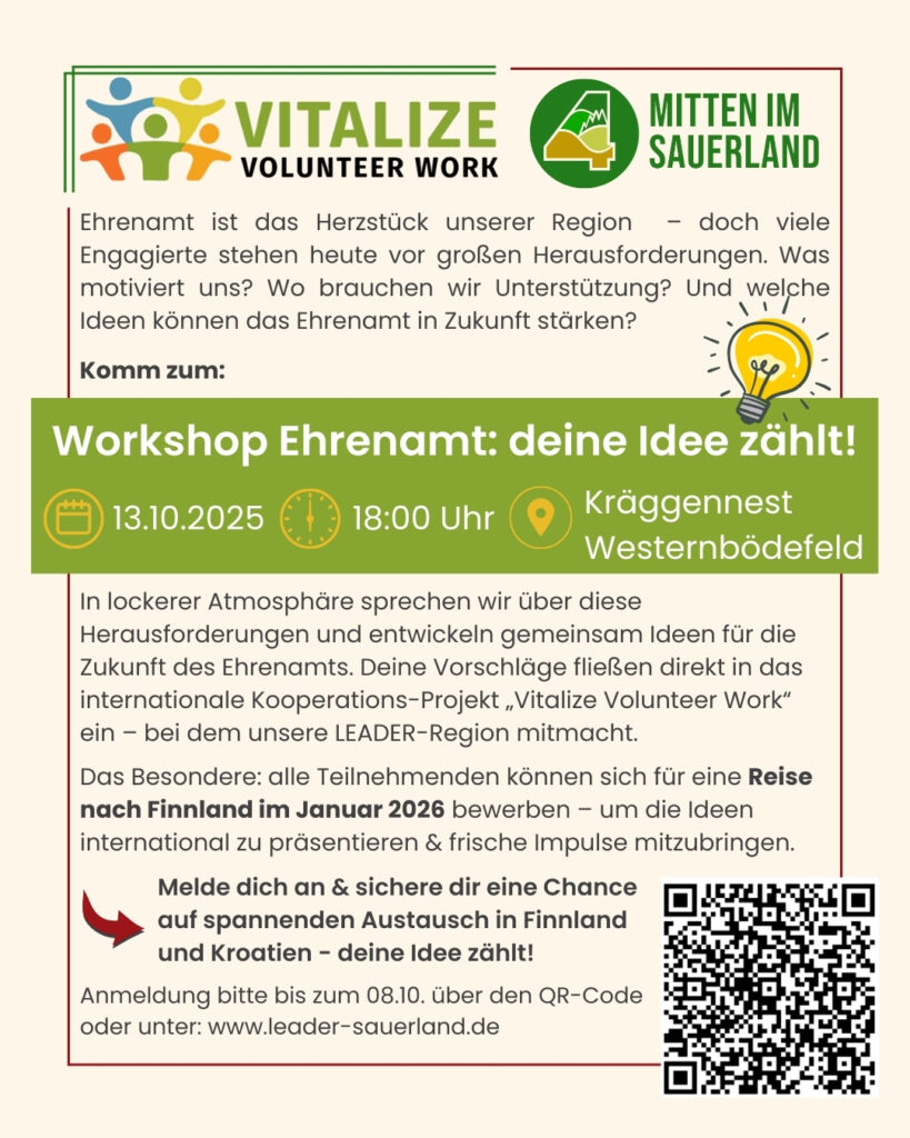 https://www.leader-sauerland.de/2025/09/workshop-ehrenamt/ bzw. https://forms.office.com/Pages/ResponsePage.aspx?id=DQSIkWdsW0yxEjajBLZtrQAAAAAAAAAAAAO__RrToKdUN0NMQVIwUzJWQVZIUFJMQ0RPSjBBWlk2VS4u